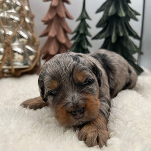 Color: Merle with white tuxedo markings and tan points